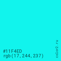 Цвет #11F4ED в цветовой модели RGB обозначается тремя октетами (17, 244, 237) в десятичном формате и #11F4ED в шестнадцатиричном (hex) формате, которые являются интенсивностью красного 17 (hex 11), интенсивность зелёного 244 (hex F4) и интенсивность синего 237 (hex ED).