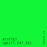 Цвет #11F737 в цветовой модели RGB обозначается тремя октетами (17, 247, 55) в десятичном формате и #11F737 в шестнадцатиричном (hex) формате, которые являются интенсивностью красного 17 (hex 11), интенсивность зелёного 247 (hex F7) и интенсивность синего 55 (hex 37).