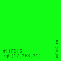 Цвет #11FD15 в цветовой модели RGB обозначается тремя октетами (17, 253, 21) в десятичном формате и #11FD15 в шестнадцатиричном (hex) формате, которые являются интенсивностью красного 17 (hex 11), интенсивность зелёного 253 (hex FD) и интенсивность синего 21 (hex 15).