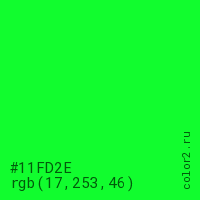 Цвет #11FD2E в цветовой модели RGB обозначается тремя октетами (17, 253, 46) в десятичном формате и #11FD2E в шестнадцатиричном (hex) формате, которые являются интенсивностью красного 17 (hex 11), интенсивность зелёного 253 (hex FD) и интенсивность синего 46 (hex 2E).