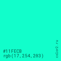 Цвет #11FECB в цветовой модели RGB обозначается тремя октетами (17, 254, 203) в десятичном формате и #11FECB в шестнадцатиричном (hex) формате, которые являются интенсивностью красного 17 (hex 11), интенсивность зелёного 254 (hex FE) и интенсивность синего 203 (hex CB).