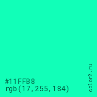 Цвет #11FFB8 в цветовой модели RGB обозначается тремя октетами (17, 255, 184) в десятичном формате и #11FFB8 в шестнадцатиричном (hex) формате, которые являются интенсивностью красного 17 (hex 11), интенсивность зелёного 255 (hex FF) и интенсивность синего 184 (hex B8).