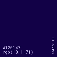 Цвет #120147 в цветовой модели RGB обозначается тремя октетами (18, 1, 71) в десятичном формате и #120147 в шестнадцатиричном (hex) формате, которые являются интенсивностью красного 18 (hex 12), интенсивность зелёного 1 (hex 01) и интенсивность синего 71 (hex 47).