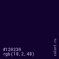 Цвет #120230 в цветовой модели RGB обозначается тремя октетами (18, 2, 48) в десятичном формате и #120230 в шестнадцатиричном (hex) формате, которые являются интенсивностью красного 18 (hex 12), интенсивность зелёного 2 (hex 02) и интенсивность синего 48 (hex 30).