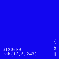 Цвет #1206F0 в цветовой модели RGB обозначается тремя октетами (18, 6, 240) в десятичном формате и #1206F0 в шестнадцатиричном (hex) формате, которые являются интенсивностью красного 18 (hex 12), интенсивность зелёного 6 (hex 06) и интенсивность синего 240 (hex F0).