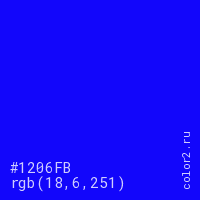 Цвет #1206FB в цветовой модели RGB обозначается тремя октетами (18, 6, 251) в десятичном формате и #1206FB в шестнадцатиричном (hex) формате, которые являются интенсивностью красного 18 (hex 12), интенсивность зелёного 6 (hex 06) и интенсивность синего 251 (hex FB).