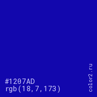 Цвет #1207AD в цветовой модели RGB обозначается тремя октетами (18, 7, 173) в десятичном формате и #1207AD в шестнадцатиричном (hex) формате, которые являются интенсивностью красного 18 (hex 12), интенсивность зелёного 7 (hex 07) и интенсивность синего 173 (hex AD).