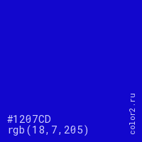 Цвет #1207CD в цветовой модели RGB обозначается тремя октетами (18, 7, 205) в десятичном формате и #1207CD в шестнадцатиричном (hex) формате, которые являются интенсивностью красного 18 (hex 12), интенсивность зелёного 7 (hex 07) и интенсивность синего 205 (hex CD).