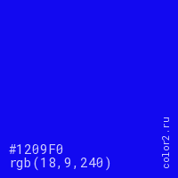 Цвет #1209F0 в цветовой модели RGB обозначается тремя октетами (18, 9, 240) в десятичном формате и #1209F0 в шестнадцатиричном (hex) формате, которые являются интенсивностью красного 18 (hex 12), интенсивность зелёного 9 (hex 09) и интенсивность синего 240 (hex F0).