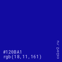 Цвет #120BA1 в цветовой модели RGB обозначается тремя октетами (18, 11, 161) в десятичном формате и #120BA1 в шестнадцатиричном (hex) формате, которые являются интенсивностью красного 18 (hex 12), интенсивность зелёного 11 (hex 0B) и интенсивность синего 161 (hex A1).