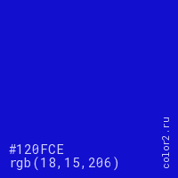 Цвет #120FCE в цветовой модели RGB обозначается тремя октетами (18, 15, 206) в десятичном формате и #120FCE в шестнадцатиричном (hex) формате, которые являются интенсивностью красного 18 (hex 12), интенсивность зелёного 15 (hex 0F) и интенсивность синего 206 (hex CE).