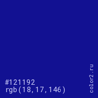 Цвет #121192 в цветовой модели RGB обозначается тремя октетами (18, 17, 146) в десятичном формате и #121192 в шестнадцатиричном (hex) формате, которые являются интенсивностью красного 18 (hex 12), интенсивность зелёного 17 (hex 11) и интенсивность синего 146 (hex 92).