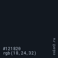 Цвет #121820 в цветовой модели RGB обозначается тремя октетами (18, 24, 32) в десятичном формате и #121820 в шестнадцатиричном (hex) формате, которые являются интенсивностью красного 18 (hex 12), интенсивность зелёного 24 (hex 18) и интенсивность синего 32 (hex 20).