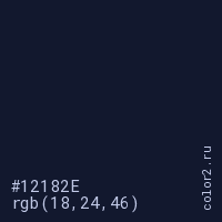 Цвет #12182E в цветовой модели RGB обозначается тремя октетами (18, 24, 46) в десятичном формате и #12182E в шестнадцатиричном (hex) формате, которые являются интенсивностью красного 18 (hex 12), интенсивность зелёного 24 (hex 18) и интенсивность синего 46 (hex 2E).