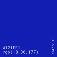 Цвет #121EB1 в цветовой модели RGB обозначается тремя октетами (18, 30, 177) в десятичном формате и #121EB1 в шестнадцатиричном (hex) формате, которые являются интенсивностью красного 18 (hex 12), интенсивность зелёного 30 (hex 1E) и интенсивность синего 177 (hex B1).
