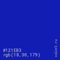 Цвет #121EB3 в цветовой модели RGB обозначается тремя октетами (18, 30, 179) в десятичном формате и #121EB3 в шестнадцатиричном (hex) формате, которые являются интенсивностью красного 18 (hex 12), интенсивность зелёного 30 (hex 1E) и интенсивность синего 179 (hex B3).