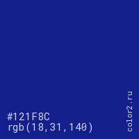 Цвет #121F8C в цветовой модели RGB обозначается тремя октетами (18, 31, 140) в десятичном формате и #121F8C в шестнадцатиричном (hex) формате, которые являются интенсивностью красного 18 (hex 12), интенсивность зелёного 31 (hex 1F) и интенсивность синего 140 (hex 8C).