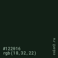 Цвет #122016 в цветовой модели RGB обозначается тремя октетами (18, 32, 22) в десятичном формате и #122016 в шестнадцатиричном (hex) формате, которые являются интенсивностью красного 18 (hex 12), интенсивность зелёного 32 (hex 20) и интенсивность синего 22 (hex 16).