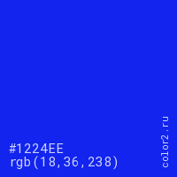 Цвет #1224EE в цветовой модели RGB обозначается тремя октетами (18, 36, 238) в десятичном формате и #1224EE в шестнадцатиричном (hex) формате, которые являются интенсивностью красного 18 (hex 12), интенсивность зелёного 36 (hex 24) и интенсивность синего 238 (hex EE).