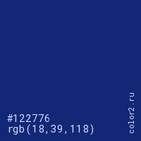 Цвет #122776 в цветовой модели RGB обозначается тремя октетами (18, 39, 118) в десятичном формате и #122776 в шестнадцатиричном (hex) формате, которые являются интенсивностью красного 18 (hex 12), интенсивность зелёного 39 (hex 27) и интенсивность синего 118 (hex 76).