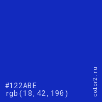 Цвет #122ABE в цветовой модели RGB обозначается тремя октетами (18, 42, 190) в десятичном формате и #122ABE в шестнадцатиричном (hex) формате, которые являются интенсивностью красного 18 (hex 12), интенсивность зелёного 42 (hex 2A) и интенсивность синего 190 (hex BE).