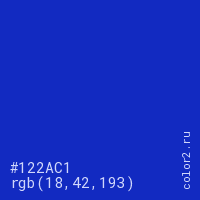 Цвет #122AC1 в цветовой модели RGB обозначается тремя октетами (18, 42, 193) в десятичном формате и #122AC1 в шестнадцатиричном (hex) формате, которые являются интенсивностью красного 18 (hex 12), интенсивность зелёного 42 (hex 2A) и интенсивность синего 193 (hex C1).