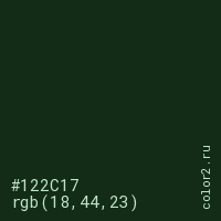 Цвет #122C17 в цветовой модели RGB обозначается тремя октетами (18, 44, 23) в десятичном формате и #122C17 в шестнадцатиричном (hex) формате, которые являются интенсивностью красного 18 (hex 12), интенсивность зелёного 44 (hex 2C) и интенсивность синего 23 (hex 17).