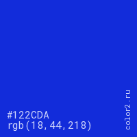 Цвет #122CDA в цветовой модели RGB обозначается тремя октетами (18, 44, 218) в десятичном формате и #122CDA в шестнадцатиричном (hex) формате, которые являются интенсивностью красного 18 (hex 12), интенсивность зелёного 44 (hex 2C) и интенсивность синего 218 (hex DA).