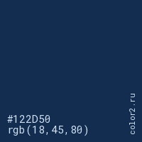 Цвет #122D50 в цветовой модели RGB обозначается тремя октетами (18, 45, 80) в десятичном формате и #122D50 в шестнадцатиричном (hex) формате, которые являются интенсивностью красного 18 (hex 12), интенсивность зелёного 45 (hex 2D) и интенсивность синего 80 (hex 50).
