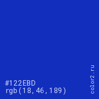 Цвет #122EBD в цветовой модели RGB обозначается тремя октетами (18, 46, 189) в десятичном формате и #122EBD в шестнадцатиричном (hex) формате, которые являются интенсивностью красного 18 (hex 12), интенсивность зелёного 46 (hex 2E) и интенсивность синего 189 (hex BD).