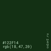 Цвет #122F14 в цветовой модели RGB обозначается тремя октетами (18, 47, 20) в десятичном формате и #122F14 в шестнадцатиричном (hex) формате, которые являются интенсивностью красного 18 (hex 12), интенсивность зелёного 47 (hex 2F) и интенсивность синего 20 (hex 14).