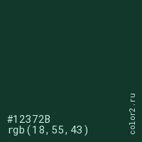 Цвет #12372B в цветовой модели RGB обозначается тремя октетами (18, 55, 43) в десятичном формате и #12372B в шестнадцатиричном (hex) формате, которые являются интенсивностью красного 18 (hex 12), интенсивность зелёного 55 (hex 37) и интенсивность синего 43 (hex 2B).