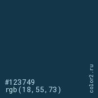 Цвет #123749 в цветовой модели RGB обозначается тремя октетами (18, 55, 73) в десятичном формате и #123749 в шестнадцатиричном (hex) формате, которые являются интенсивностью красного 18 (hex 12), интенсивность зелёного 55 (hex 37) и интенсивность синего 73 (hex 49).