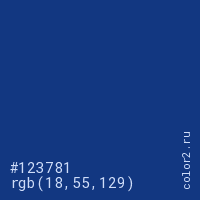 Цвет #123781 в цветовой модели RGB обозначается тремя октетами (18, 55, 129) в десятичном формате и #123781 в шестнадцатиричном (hex) формате, которые являются интенсивностью красного 18 (hex 12), интенсивность зелёного 55 (hex 37) и интенсивность синего 129 (hex 81).