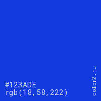Цвет #123ADE в цветовой модели RGB обозначается тремя октетами (18, 58, 222) в десятичном формате и #123ADE в шестнадцатиричном (hex) формате, которые являются интенсивностью красного 18 (hex 12), интенсивность зелёного 58 (hex 3A) и интенсивность синего 222 (hex DE).