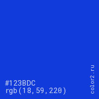 Цвет #123BDC в цветовой модели RGB обозначается тремя октетами (18, 59, 220) в десятичном формате и #123BDC в шестнадцатиричном (hex) формате, которые являются интенсивностью красного 18 (hex 12), интенсивность зелёного 59 (hex 3B) и интенсивность синего 220 (hex DC).