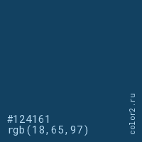 Цвет #124161 в цветовой модели RGB обозначается тремя октетами (18, 65, 97) в десятичном формате и #124161 в шестнадцатиричном (hex) формате, которые являются интенсивностью красного 18 (hex 12), интенсивность зелёного 65 (hex 41) и интенсивность синего 97 (hex 61).