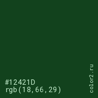 Цвет #12421D в цветовой модели RGB обозначается тремя октетами (18, 66, 29) в десятичном формате и #12421D в шестнадцатиричном (hex) формате, которые являются интенсивностью красного 18 (hex 12), интенсивность зелёного 66 (hex 42) и интенсивность синего 29 (hex 1D).