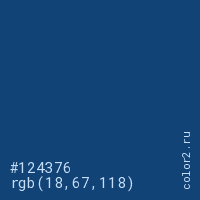 Цвет #124376 в цветовой модели RGB обозначается тремя октетами (18, 67, 118) в десятичном формате и #124376 в шестнадцатиричном (hex) формате, которые являются интенсивностью красного 18 (hex 12), интенсивность зелёного 67 (hex 43) и интенсивность синего 118 (hex 76).
