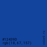Цвет #12439D в цветовой модели RGB обозначается тремя октетами (18, 67, 157) в десятичном формате и #12439D в шестнадцатиричном (hex) формате, которые являются интенсивностью красного 18 (hex 12), интенсивность зелёного 67 (hex 43) и интенсивность синего 157 (hex 9D).