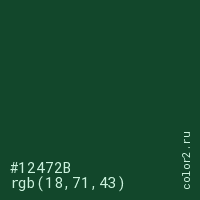 Цвет #12472B в цветовой модели RGB обозначается тремя октетами (18, 71, 43) в десятичном формате и #12472B в шестнадцатиричном (hex) формате, которые являются интенсивностью красного 18 (hex 12), интенсивность зелёного 71 (hex 47) и интенсивность синего 43 (hex 2B).
