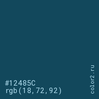 Цвет #12485C в цветовой модели RGB обозначается тремя октетами (18, 72, 92) в десятичном формате и #12485C в шестнадцатиричном (hex) формате, которые являются интенсивностью красного 18 (hex 12), интенсивность зелёного 72 (hex 48) и интенсивность синего 92 (hex 5C).