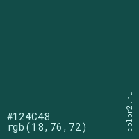Цвет #124C48 в цветовой модели RGB обозначается тремя октетами (18, 76, 72) в десятичном формате и #124C48 в шестнадцатиричном (hex) формате, которые являются интенсивностью красного 18 (hex 12), интенсивность зелёного 76 (hex 4C) и интенсивность синего 72 (hex 48).