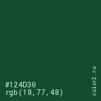 Цвет #124D30 в цветовой модели RGB обозначается тремя октетами (18, 77, 48) в десятичном формате и #124D30 в шестнадцатиричном (hex) формате, которые являются интенсивностью красного 18 (hex 12), интенсивность зелёного 77 (hex 4D) и интенсивность синего 48 (hex 30).