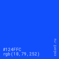 Цвет #124FFC в цветовой модели RGB обозначается тремя октетами (18, 79, 252) в десятичном формате и #124FFC в шестнадцатиричном (hex) формате, которые являются интенсивностью красного 18 (hex 12), интенсивность зелёного 79 (hex 4F) и интенсивность синего 252 (hex FC).