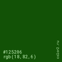 Цвет #125206 в цветовой модели RGB обозначается тремя октетами (18, 82, 6) в десятичном формате и #125206 в шестнадцатиричном (hex) формате, которые являются интенсивностью красного 18 (hex 12), интенсивность зелёного 82 (hex 52) и интенсивность синего 6 (hex 06).