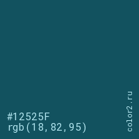 Цвет #12525F в цветовой модели RGB обозначается тремя октетами (18, 82, 95) в десятичном формате и #12525F в шестнадцатиричном (hex) формате, которые являются интенсивностью красного 18 (hex 12), интенсивность зелёного 82 (hex 52) и интенсивность синего 95 (hex 5F).