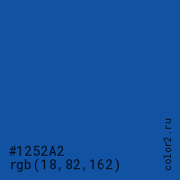 Цвет #1252A2 в цветовой модели RGB обозначается тремя октетами (18, 82, 162) в десятичном формате и #1252A2 в шестнадцатиричном (hex) формате, которые являются интенсивностью красного 18 (hex 12), интенсивность зелёного 82 (hex 52) и интенсивность синего 162 (hex A2).