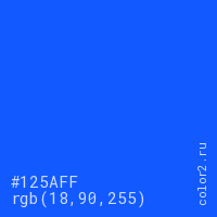 Цвет #125AFF в цветовой модели RGB обозначается тремя октетами (18, 90, 255) в десятичном формате и #125AFF в шестнадцатиричном (hex) формате, которые являются интенсивностью красного 18 (hex 12), интенсивность зелёного 90 (hex 5A) и интенсивность синего 255 (hex FF).