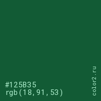 Цвет #125B35 в цветовой модели RGB обозначается тремя октетами (18, 91, 53) в десятичном формате и #125B35 в шестнадцатиричном (hex) формате, которые являются интенсивностью красного 18 (hex 12), интенсивность зелёного 91 (hex 5B) и интенсивность синего 53 (hex 35).